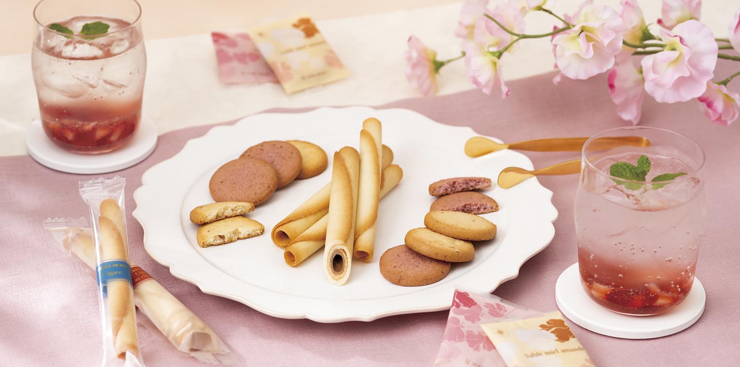 桜香るはらりとくちどけの良い食感に焼き上げたラングドシャーで、桜風味のチョコレートをサンドしました。