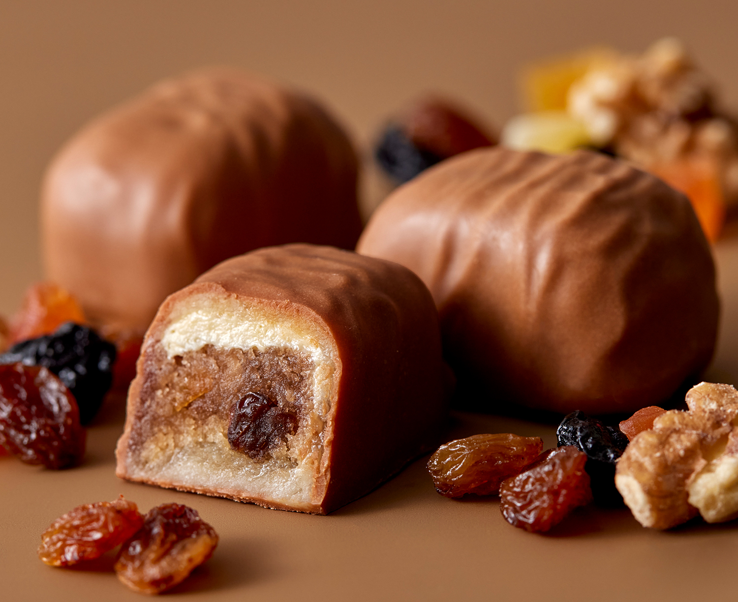 数カ月じっくり丁寧に洋酒に漬け込んだ数種類のフルーツを使用したフルーツケーキとバタークリームを、マジパンとミルクチョコレートで包み込みました。